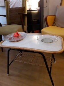 Rotan bijzettafel met een formica blad. Was vroeger vermoedelijk een glazen blad. Rotan onderblad voor kranten e.d. Zwarte metalen poten met witte beschermdoppen. 68cm x 42cm. H. 44cm. In goede vintage staat. Alleen opte halen in de winkel.