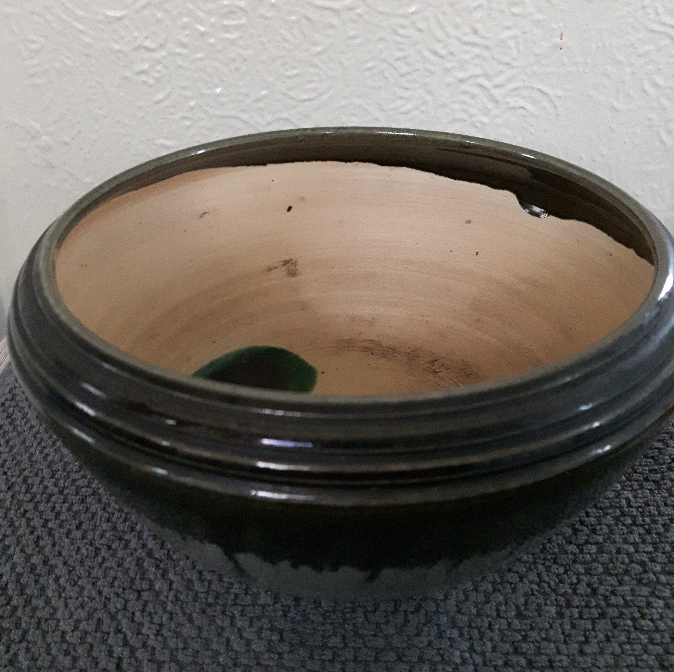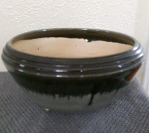 Bloempot/cactusvaasje op drie pootjes. Kleur is donker en licht grijsgroen. Diameter bovenzijde 19,5 cm. Hoogte 10,5 cm. Niet gemerkt. Een heel klein bijna onzichtbaar flintje aan 1 van de pootjes.