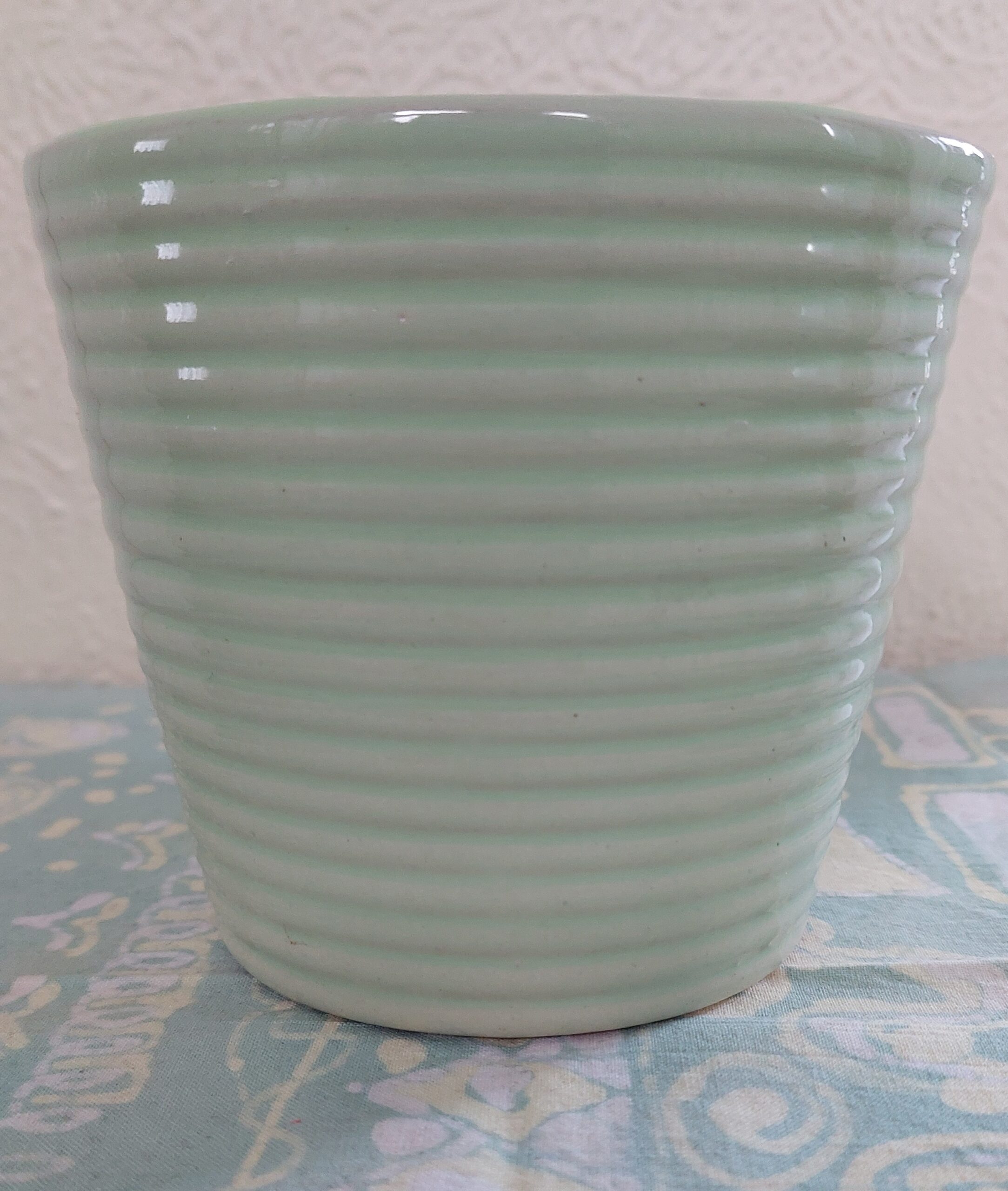 Bloempot. Lichtgroen en dwars geribbeld. Binnenkant heeft een lichtgroen glazuur. Hoogte 11.5 cm. Diameter bovenkant 12 cm en onderkant 9 cm. Niet gemerkt.