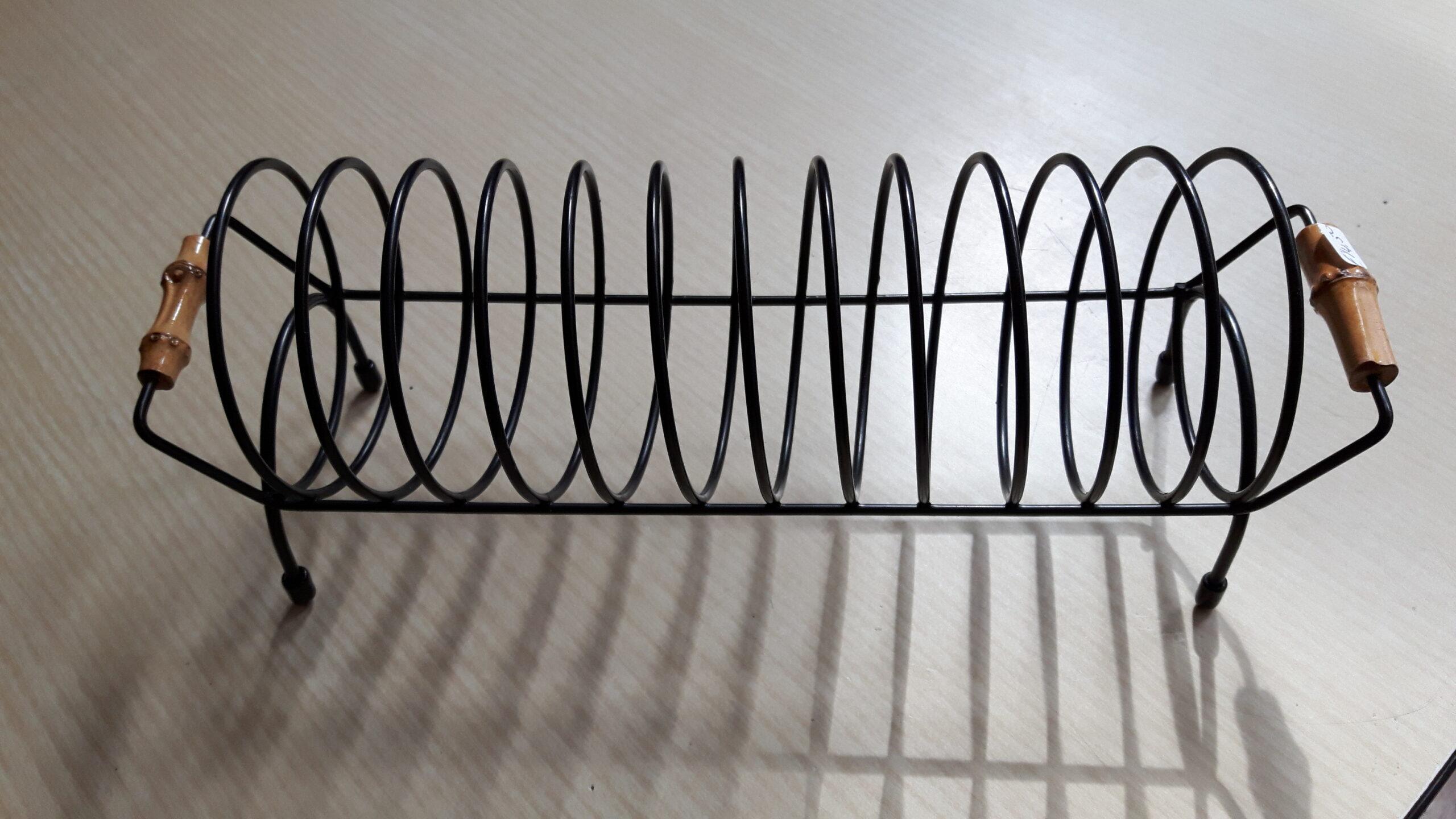 Metalen en geplastificeerde brood/toast houder met bamboe handvatten. Geschikt voor 12 broodjes. De lengte is 28 cm.