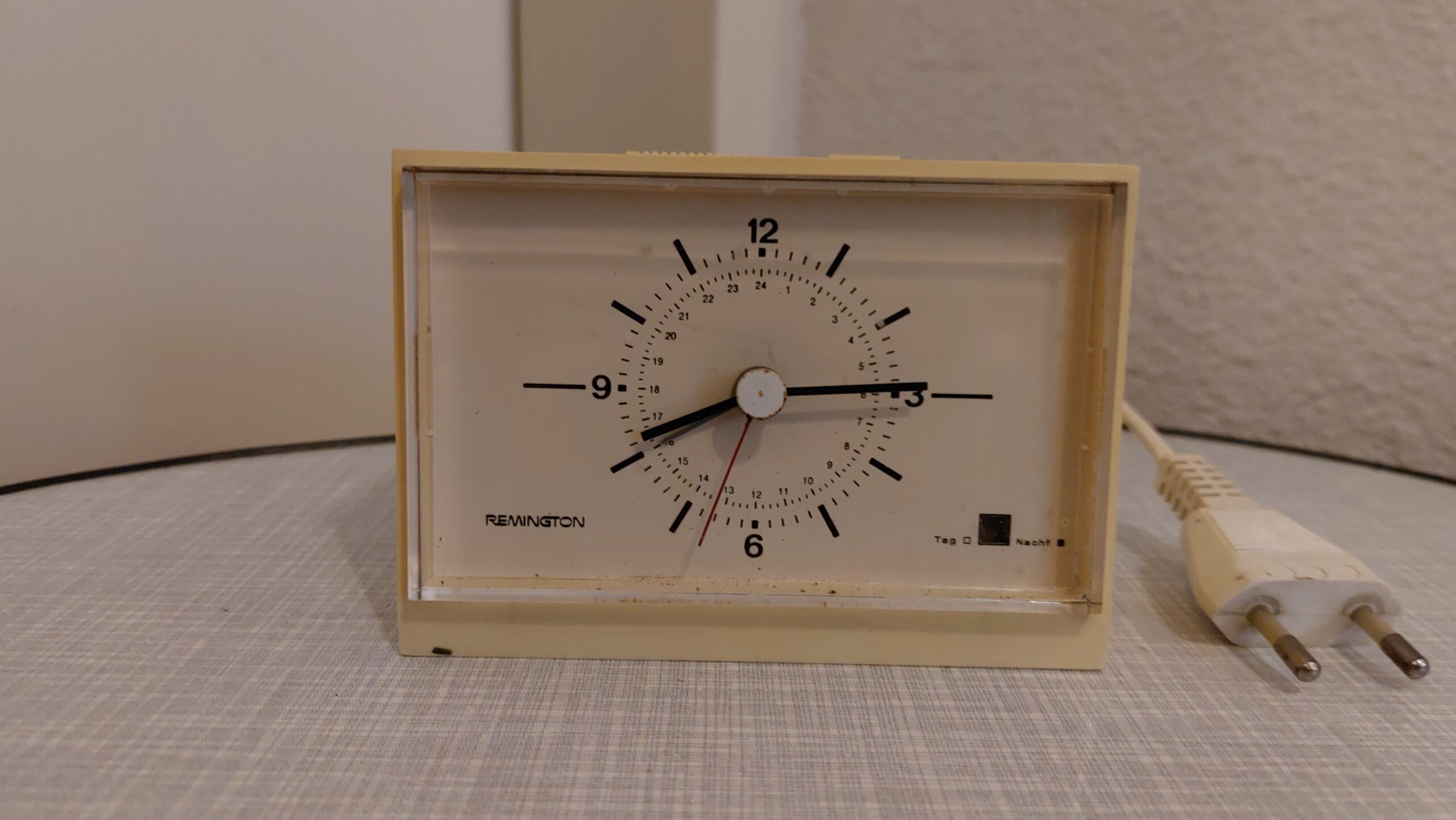 Vintage elektrische wekker van het merk Remington. De wekker is wit van kleur. Afmeteing: 10 x 15 cm. Het heeft een extra venstertje rechtsonder met aanduiding dag of nacht. De wekker is gemaakt in Duitsland in de jaren 60.