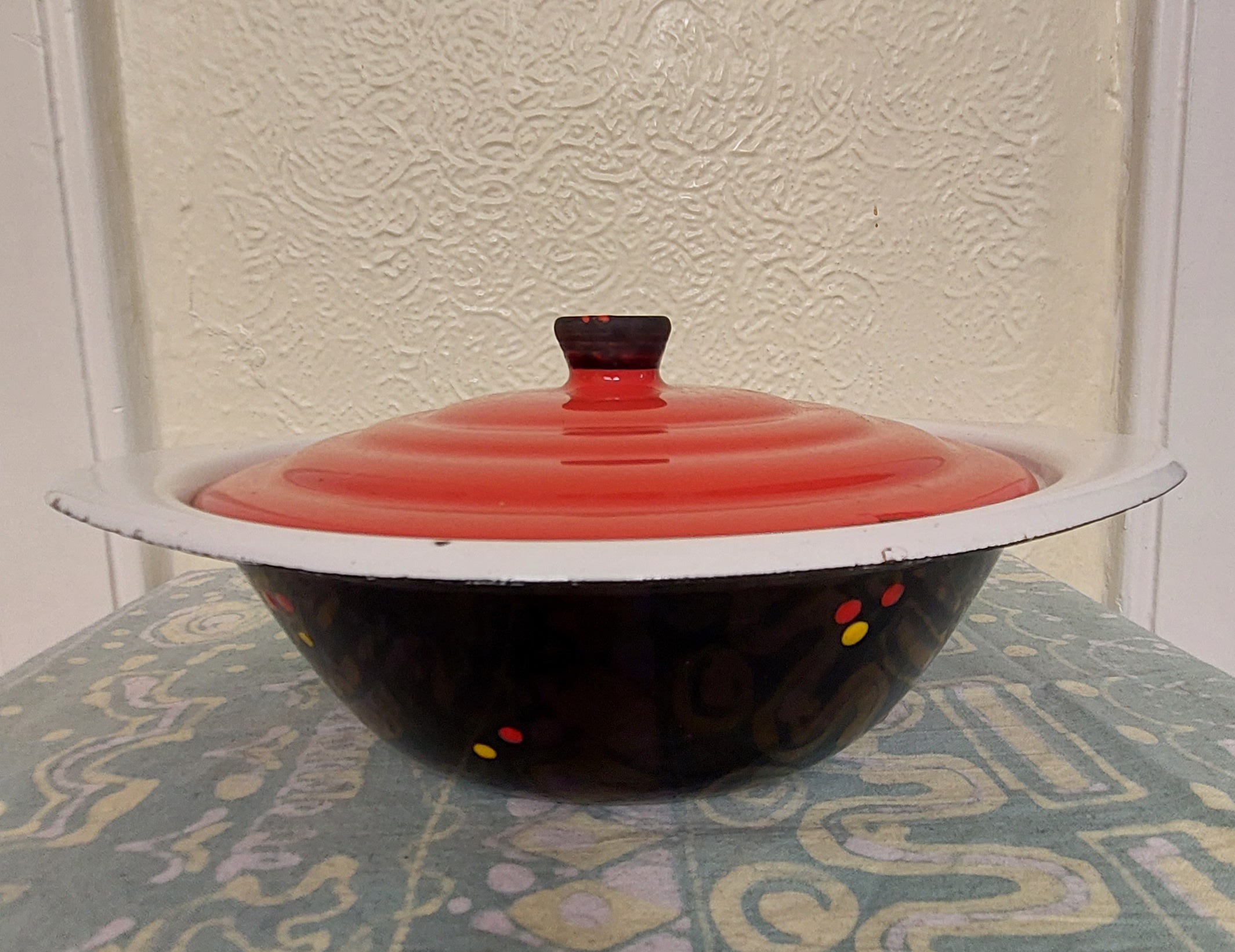 Dru Confetti emaille schaal. 50-er jaren design. Ontwerper: Wim Gillen. Zwart met gele en rode stippen. Rode deksel Doorsnede bodem is ongeveer 10 cm. Doorsnede opening bovenzijde is 17 cm. Wat kleine beschadigingen. Goede vintage staat.