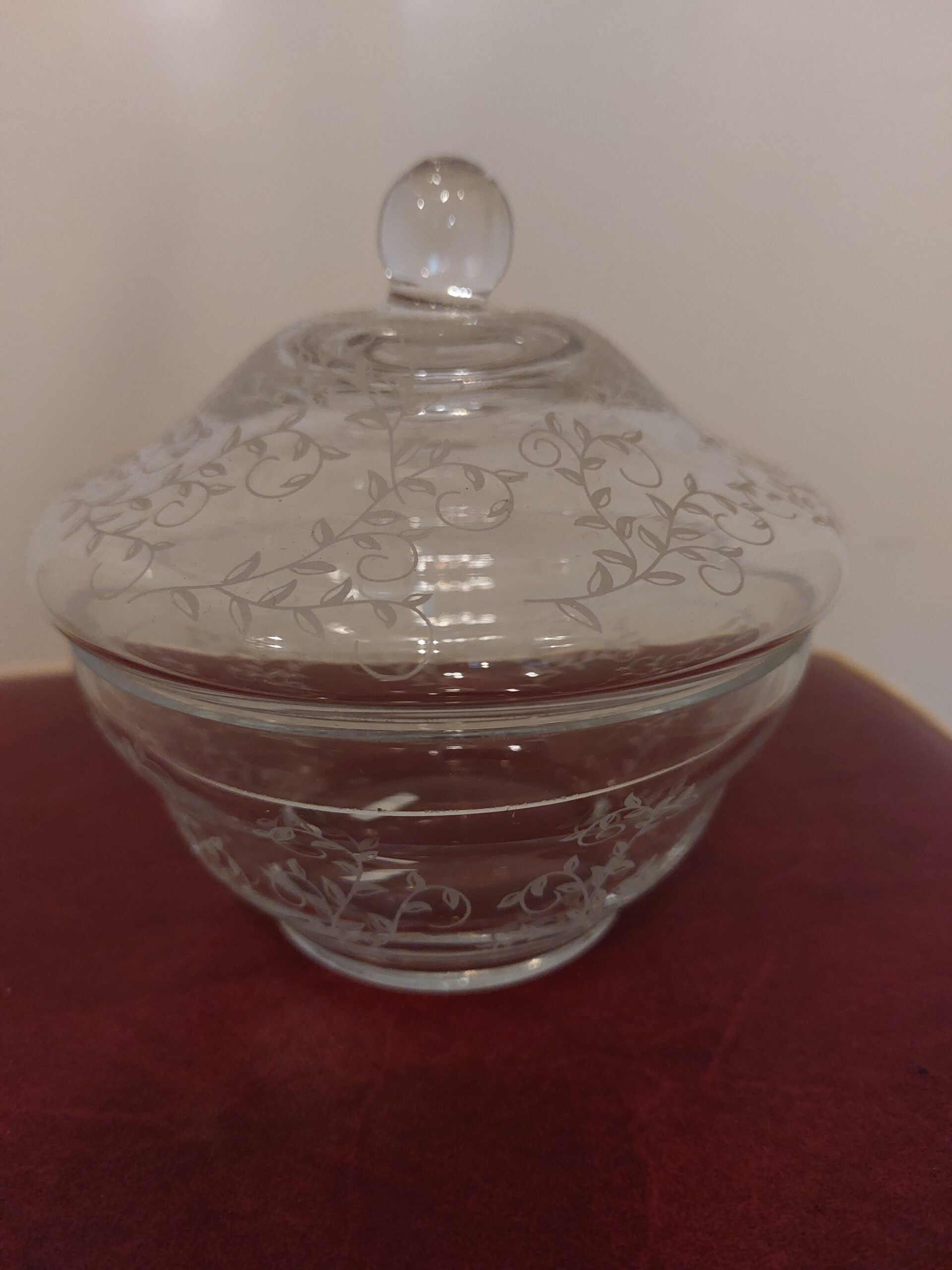 Bonbon schaaltje van fijn glas. Mooi gedecoreerd met bladmotief. Niet erin geslepen. Hoogte 12 cm. Ø opening 12 cm.
