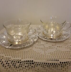 Theekopje. Houder en schotel zijn verzilverd. Het glas is van Schott Verran. Mooi bewerkt. De prijs is per stuk. Er zijn er 2 in voorraad.