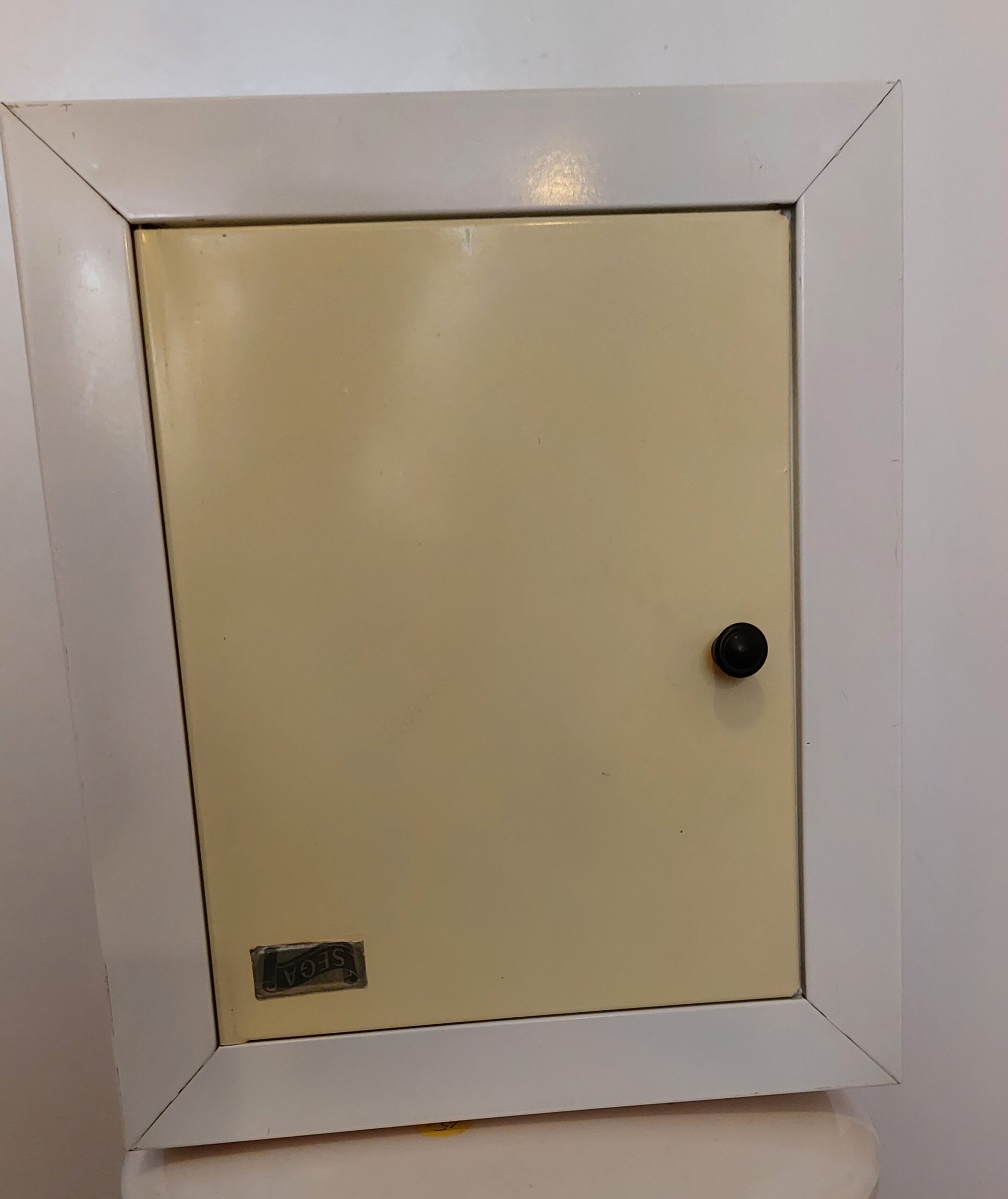 Medicijnkastje van metaal. Wit met een geel deurtje. Het kastje heeft 1 metalen plankje (met klein weggewerkt roestplekje). Merk: SEGA. H. 33cm. Br. 28cm.