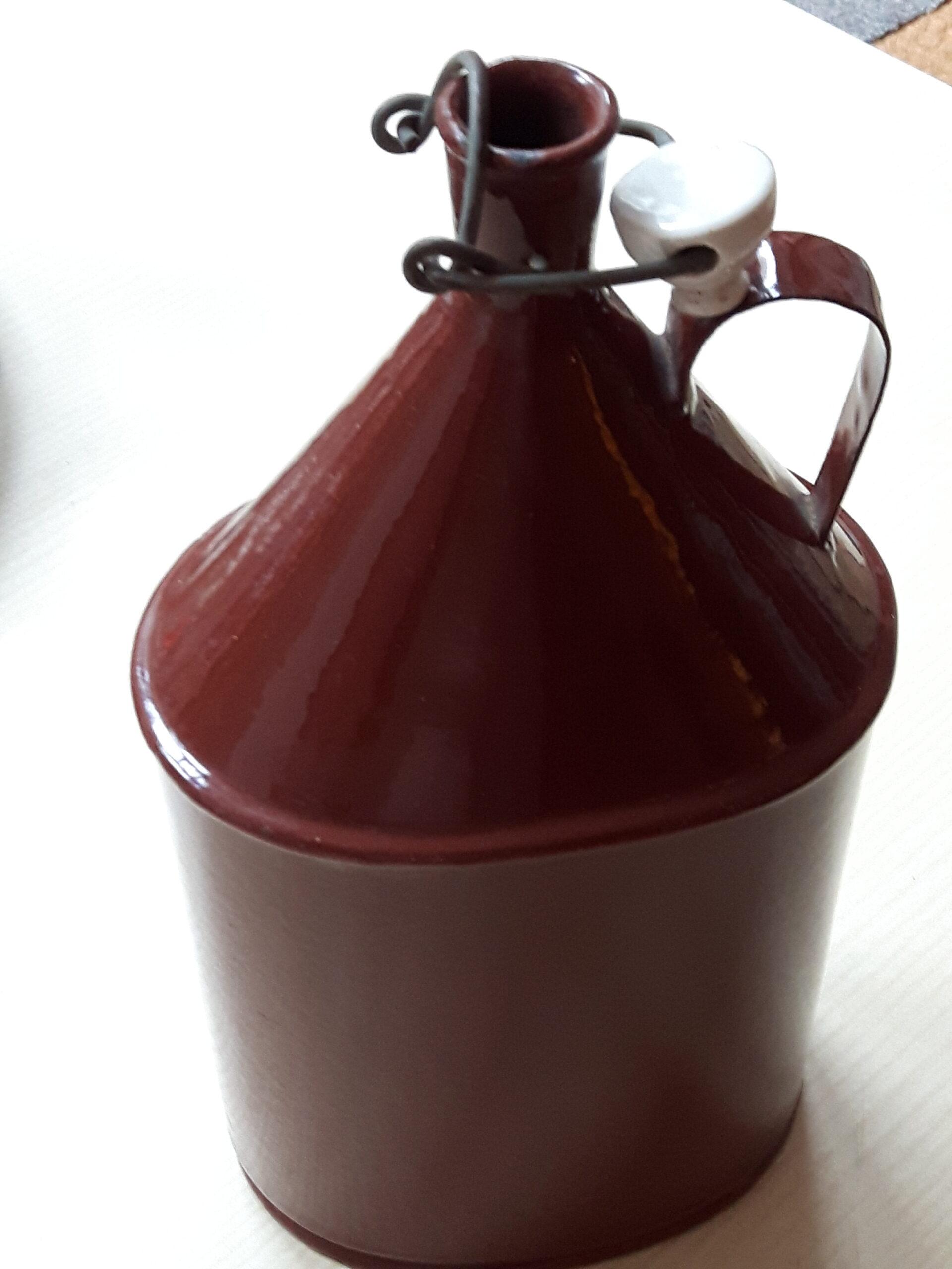 Petroleumkan van bruin emaille. Is afsluitbaar. H. 28 cm.
