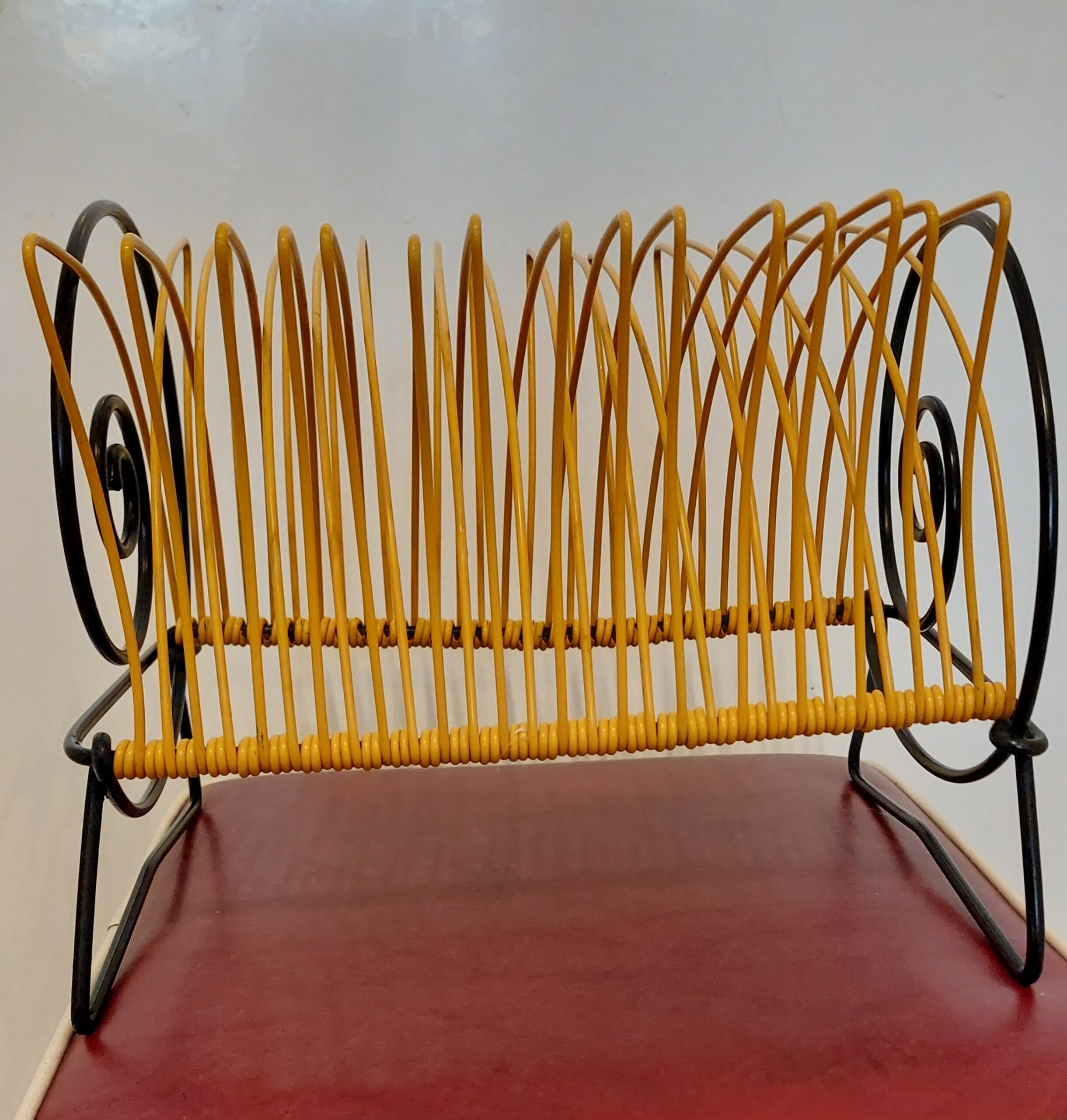 Vintage jaren ’60 design platenrek voor 28 singles (kan ook gebruikt worden voor Lp’s). Van draadstaal met gegoten plastic. In de kleuren zwart met geel. Lengte 26 cm. Breedte 19cm. Hoogte 21 cm.