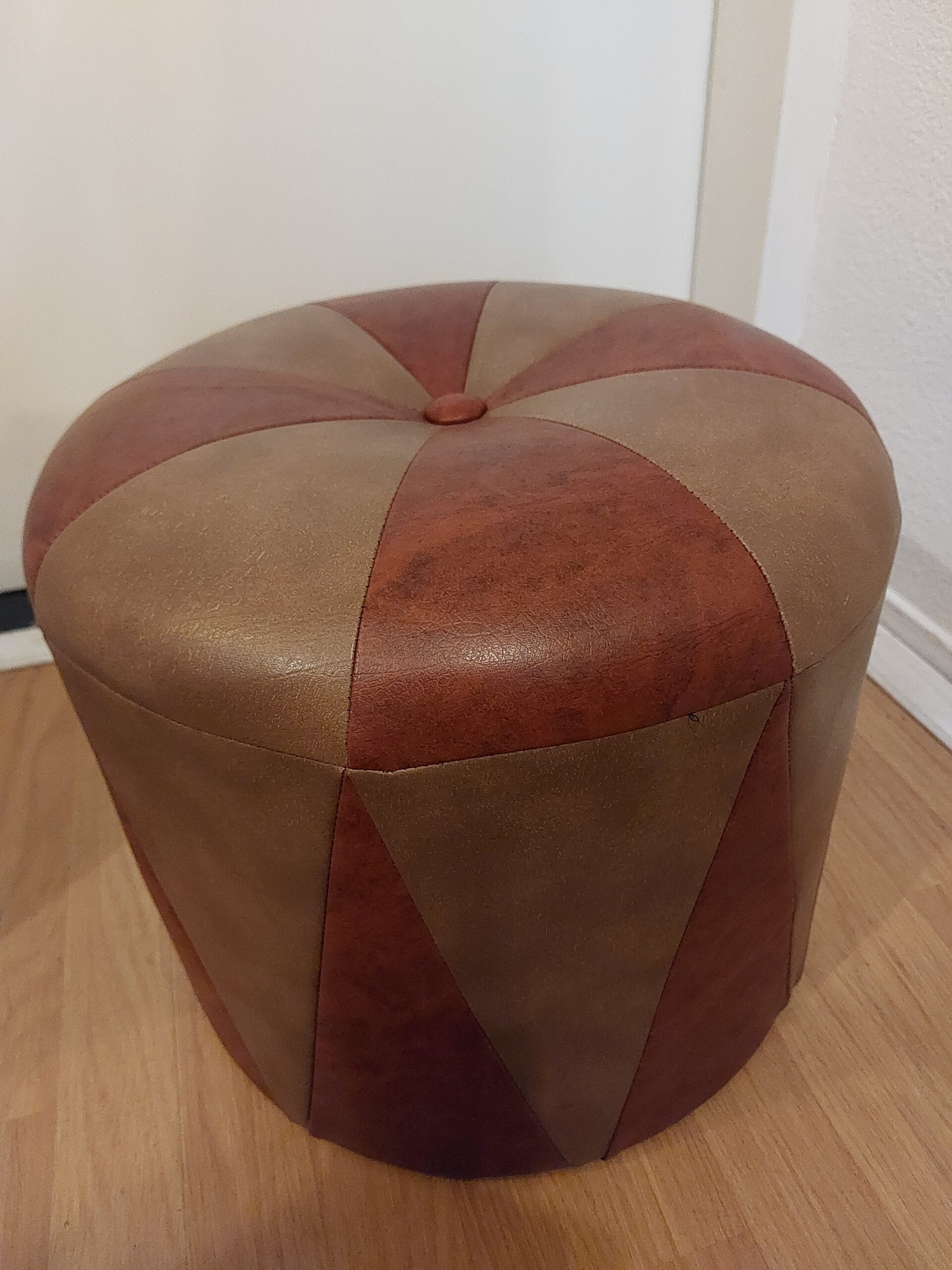 Mooie poef van skai. Roodbruin met lichtbruine driehoeken. Hoogte is 33cm, Ø is 37cm. Alleen af te halen in de winkel.