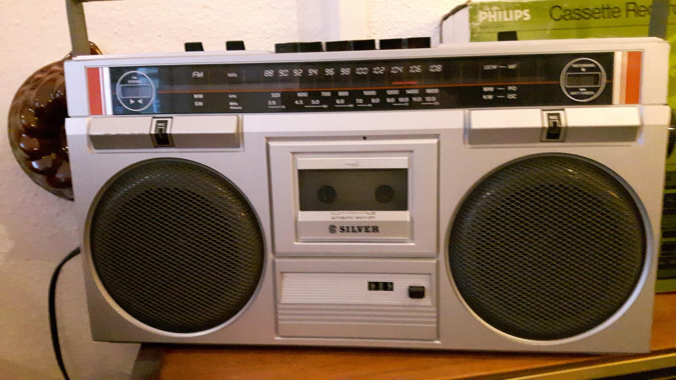 Silver draagbare radio-cassetterecorder. FM, MW en SW. Elektrisch en op batterij. Met antenne. Breedte 40 cm, Hoogte 22 cm. Alleen op te halen in de winkel.