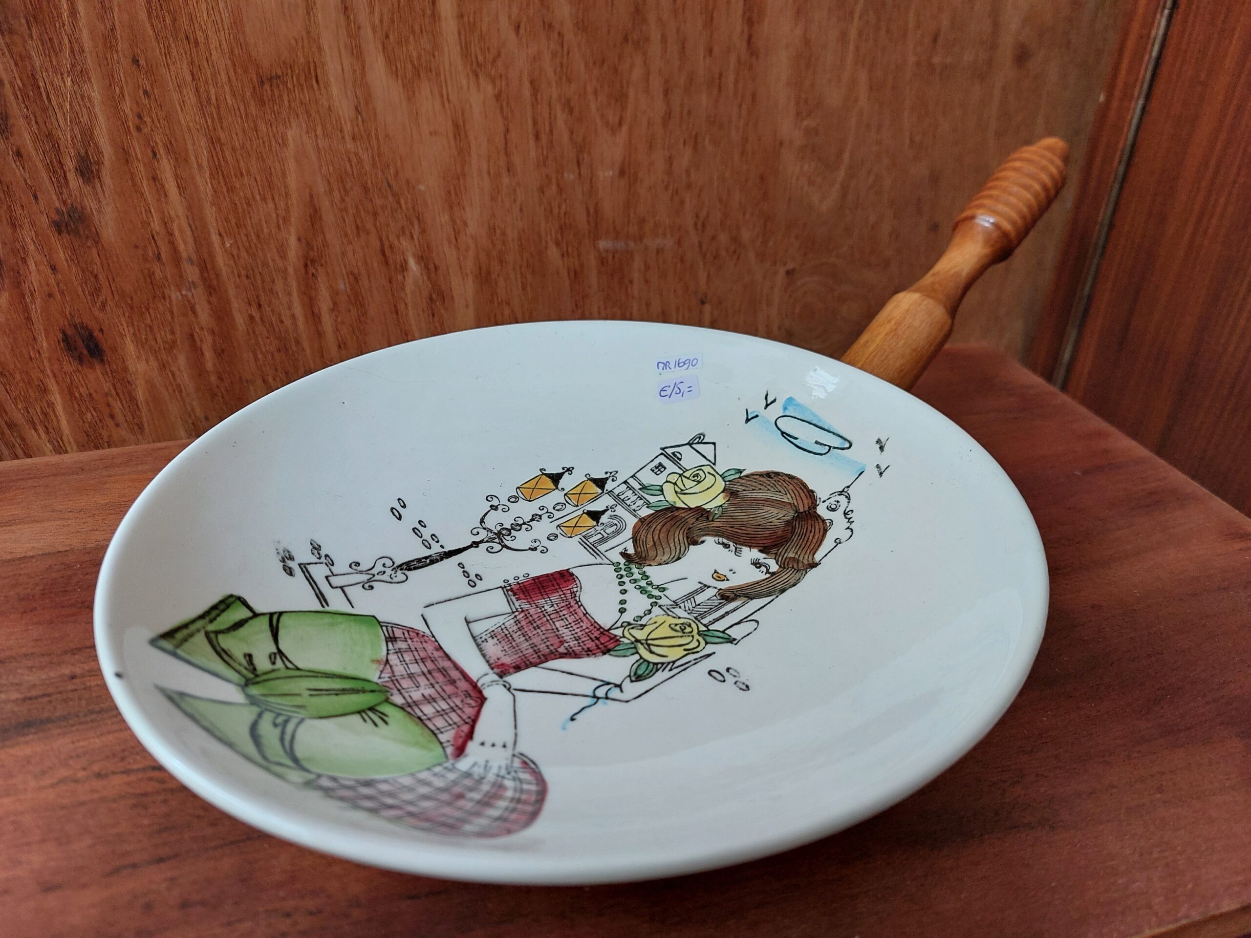 Schaal van aardewerk met houten steel. Niet gemerkt. Diameter schaal 20 cm. Lengte steel is 12 cm.