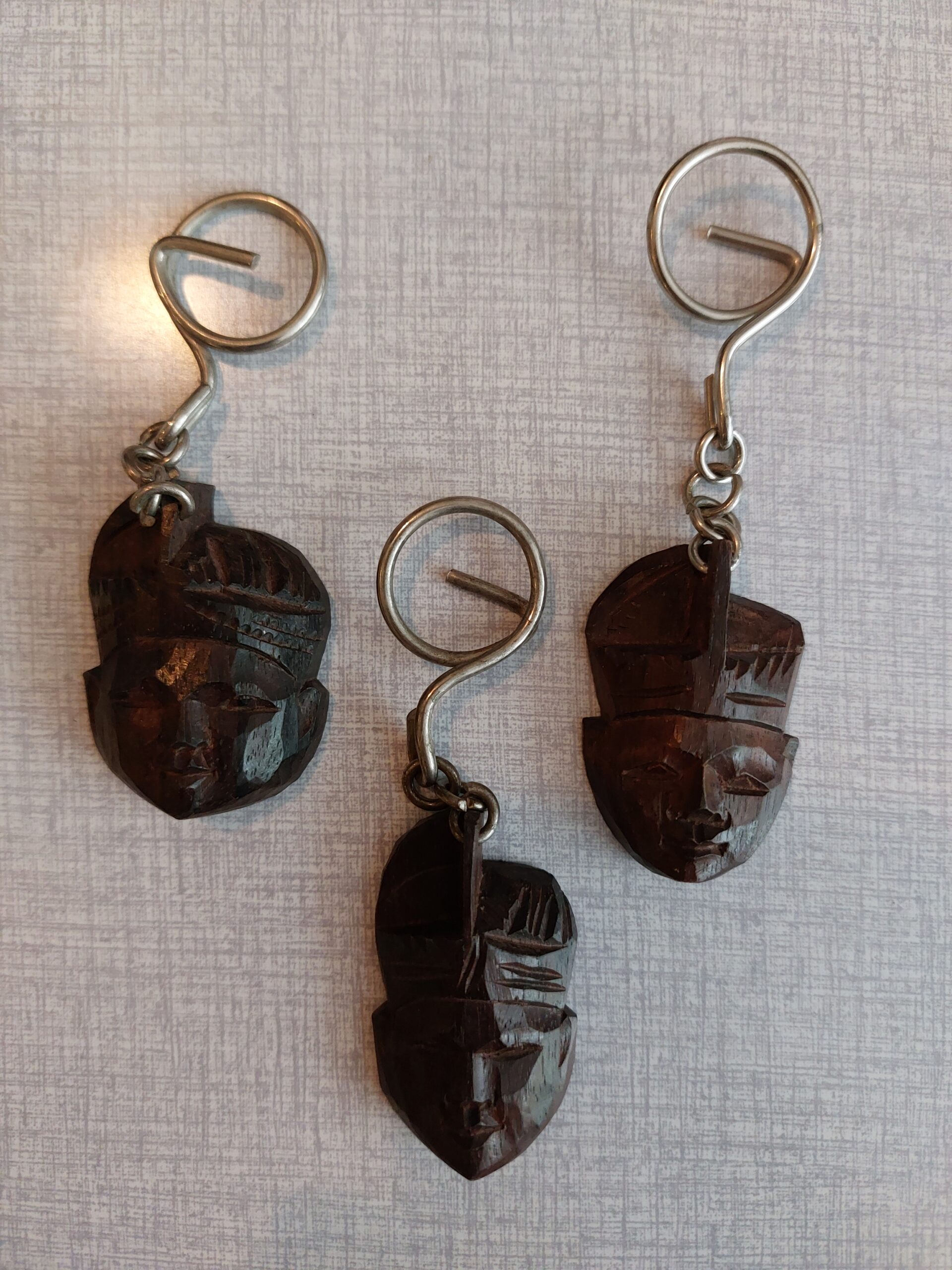 metalen sleutelhanger met houten gezichtsafbeelding. Gemaakt in Indonesië. De prijs is €2,50 per stuk. 3 hangers in voorraad.