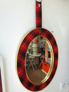 Wandspiegel. Rood, Schotse ruit. L 34 cm, B 45 cm.