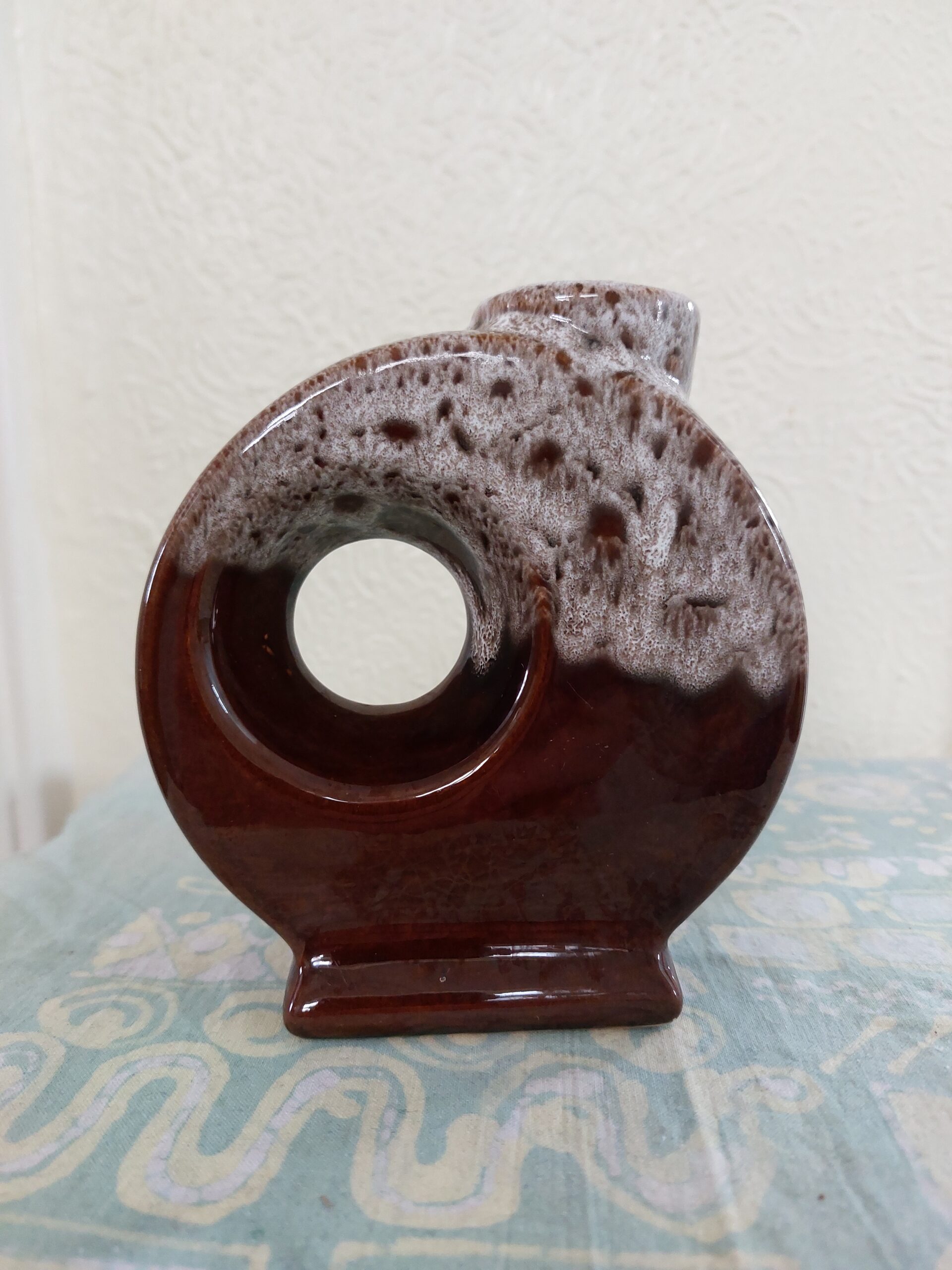 Vaas. Hoogte 14 cm en 12 cm diep. Waarschijnlijk een Afina Rijnsburg vaas. Jaren ’70. Bruine kleur. bovenzijde Fat Lava in grijs en bruin.
