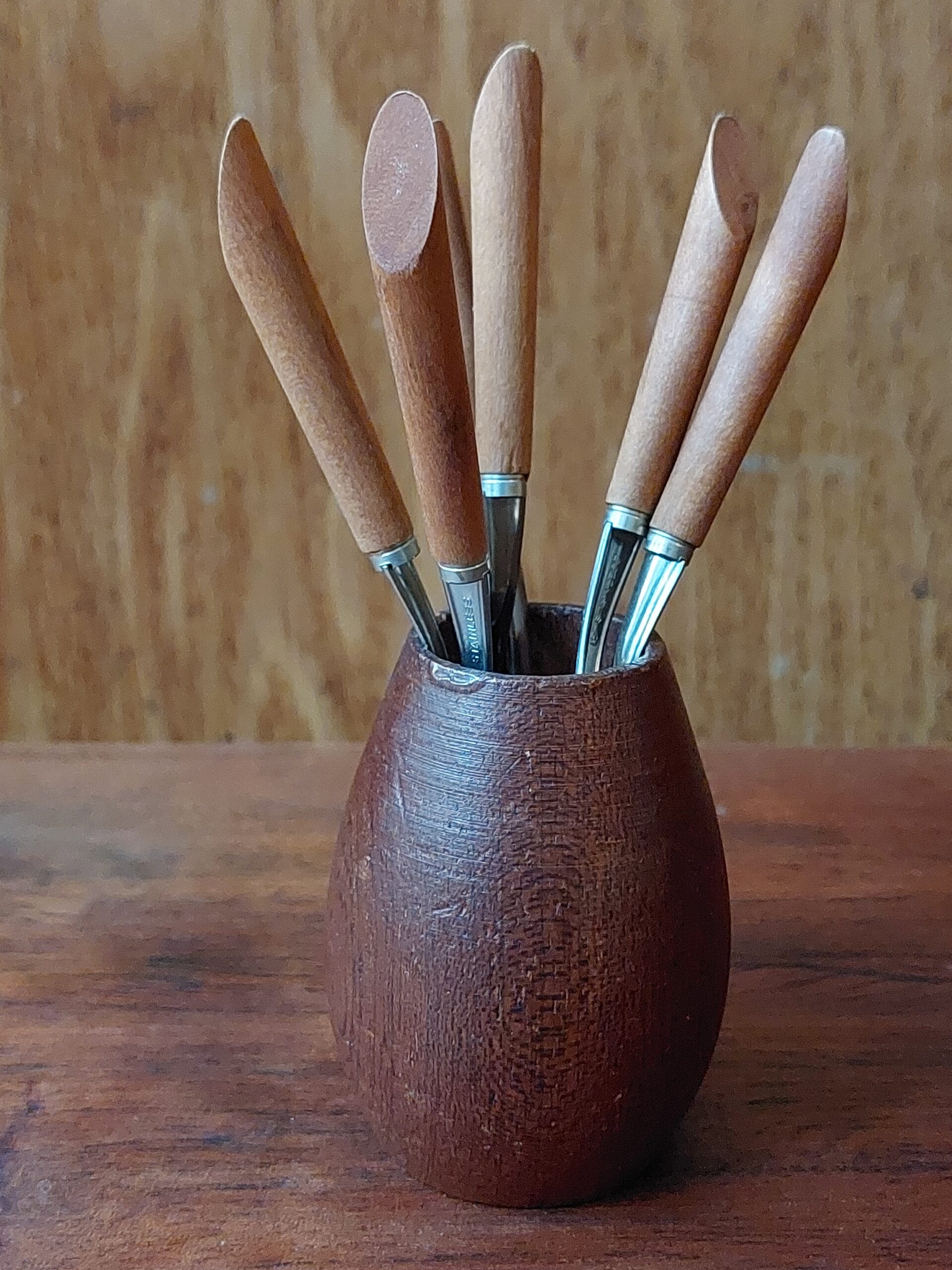Zes vintage design cocktailprikkers in een houten houder. De cocktailprikkers hebben een lengte van 10 cm en verkeren in mooie staat.