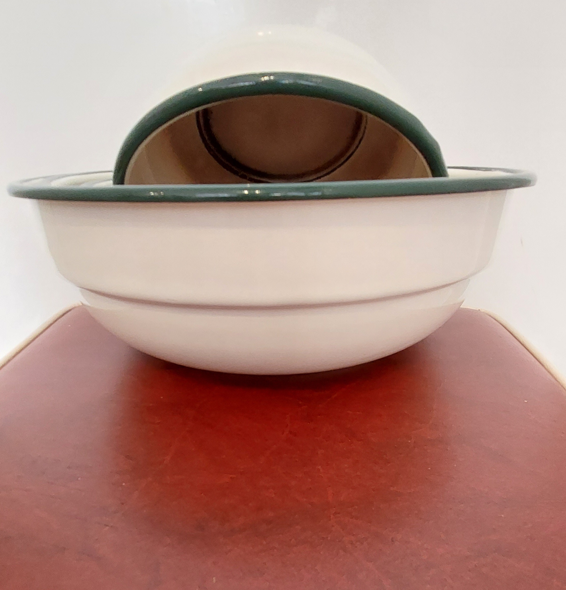 5 Vintage emaille kommen waarvan de binnenkant van de 3 kleinste kommen er gebruikt uitzien. Doorsnede 22, 20, 18, 17, 16 cm. Alles in goede vintage staat.