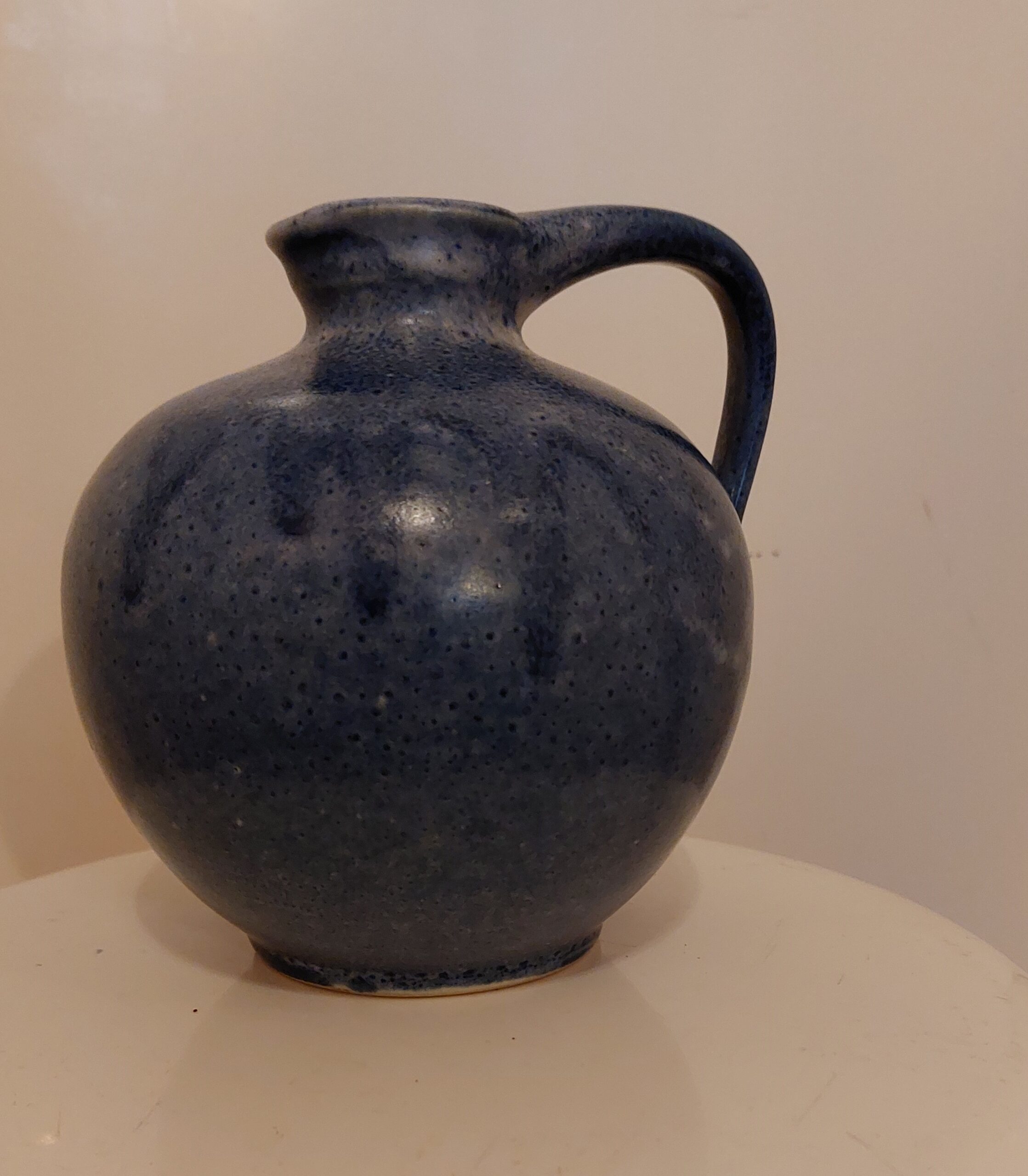 Fraaie blauwe oorvaas. Lijkt W.Germany. Niet vermeld. De vaas is gemerkt met ‘2/12’, Hoogte 14 cm. Voetwijdte is 7 cm.