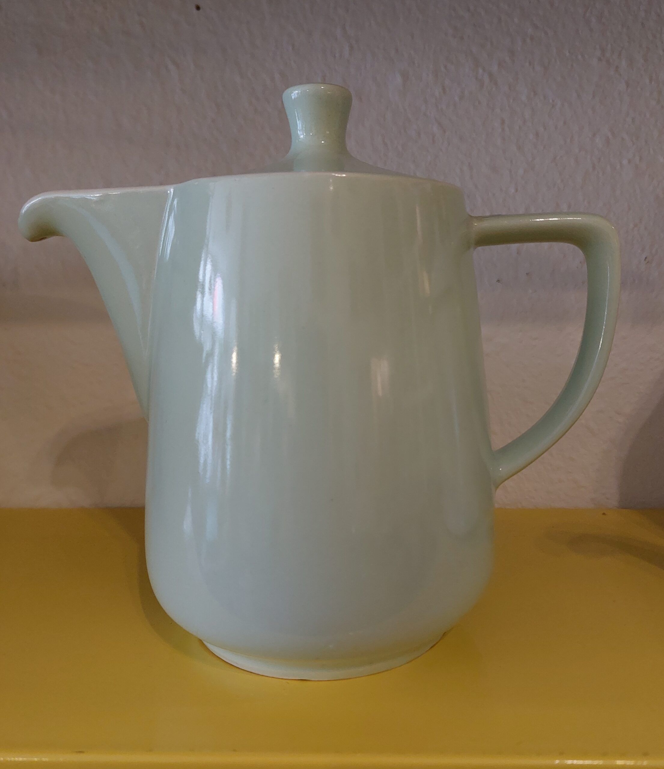 Mintgroene porseleinen theepot (of koffiepot) van Melitta uit de jaren 60 of 70 van de vorige eeuw. Duits fabricaat. Hoogte 17 cm. In goede conditie.