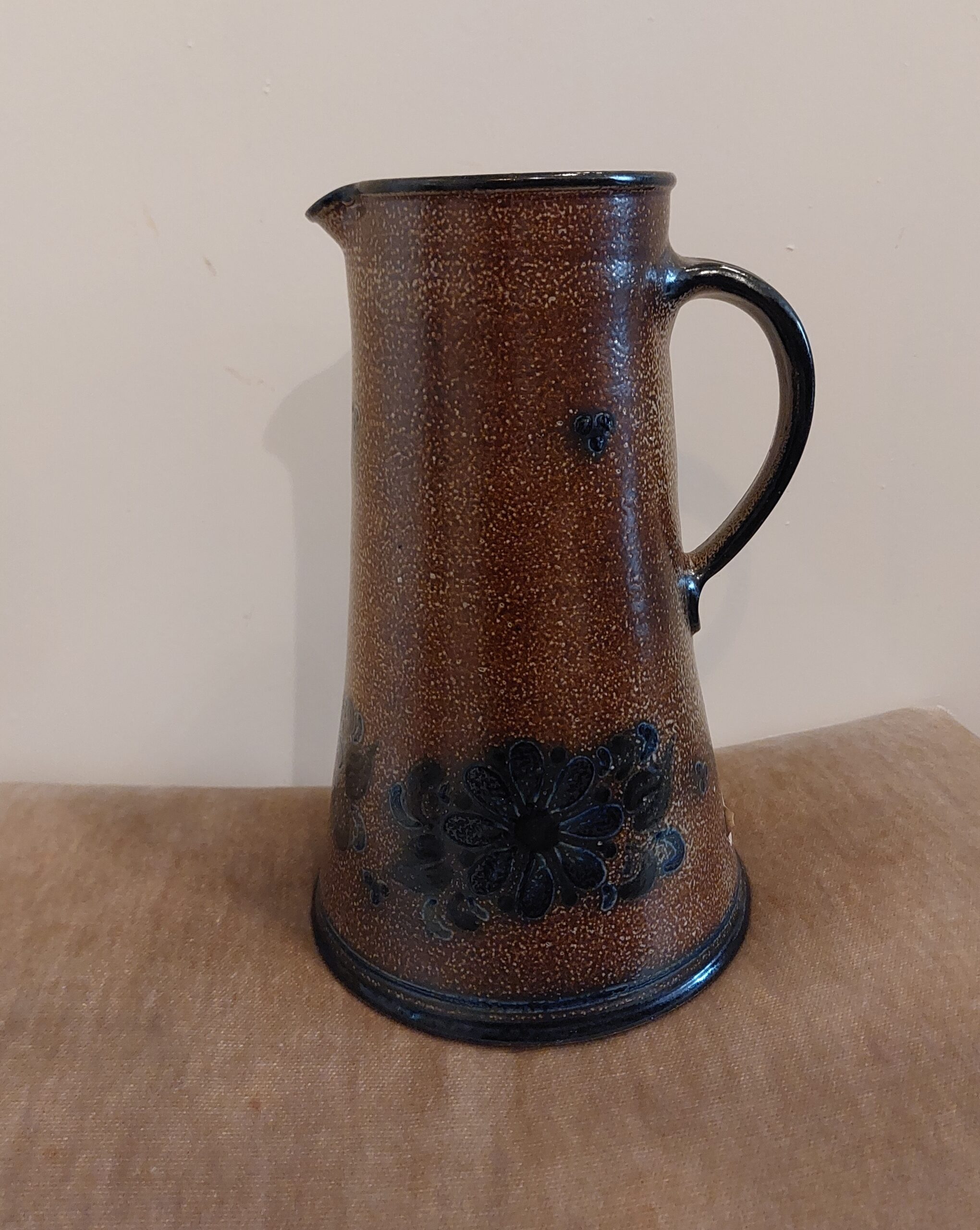 Bierkruik/vaas. Bruin met afbeelding blauwe bloemen. Topferei J. Hansen. Handgemaakt jaren ’70. zout geglazuurd. Ondertekend. Pottenbakker J Hansen. Hoogte 28 cm.