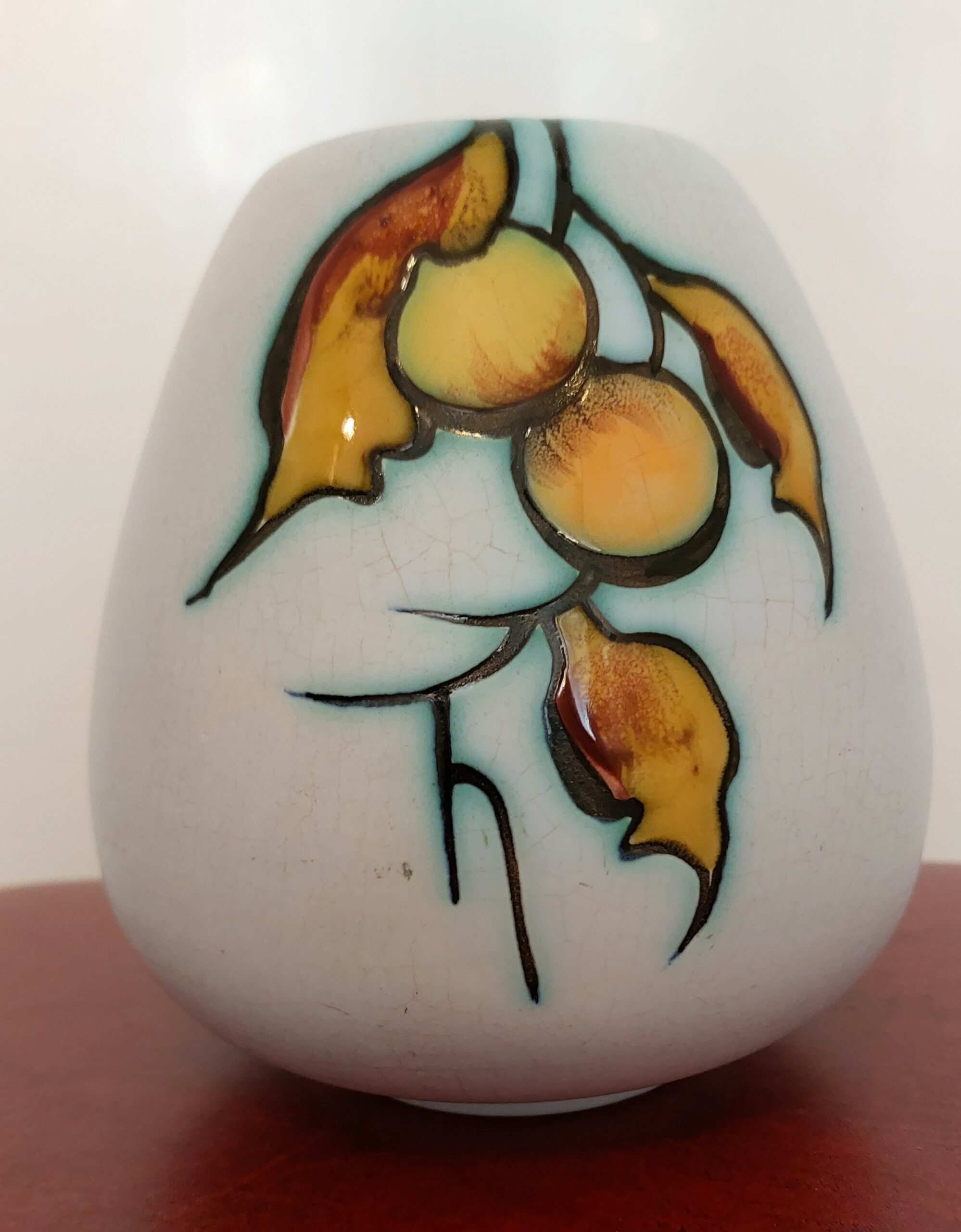 Aardenwerk vaas. Gouds Keramiek. Gouda Flora. Decor Paola. model 1042. Wit craquelé met decor van bruine bladeren en geelgroen fruit. Hoogte 15 cm. Breedste diameter 13 cm.