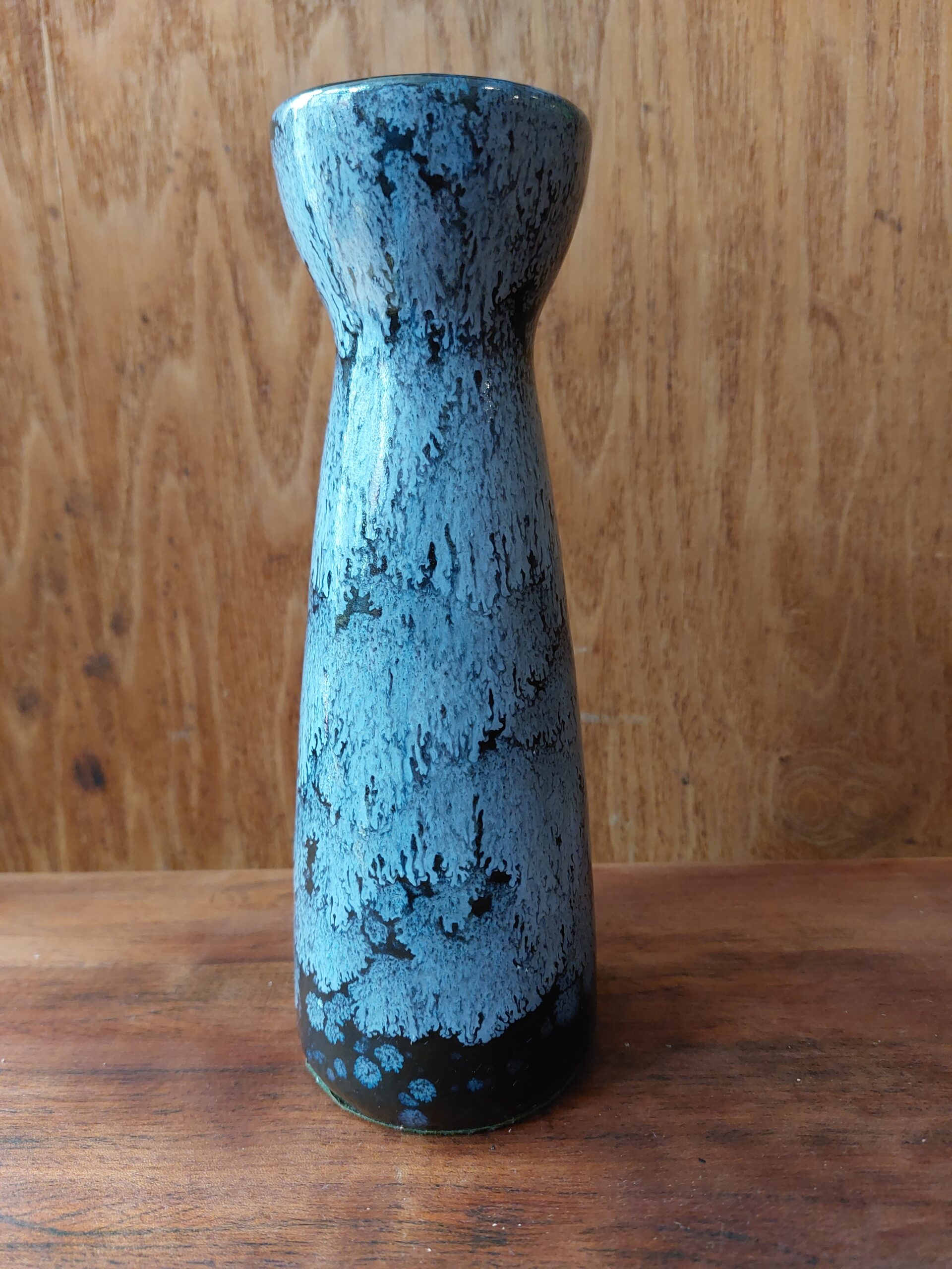 Aardenwerk Vaas. Waarschijnlijk Scheurich. W. Germany 520-22. Dus 22 cm hoog. Grijsblauw druipglazuur met wat zwarte tinten.