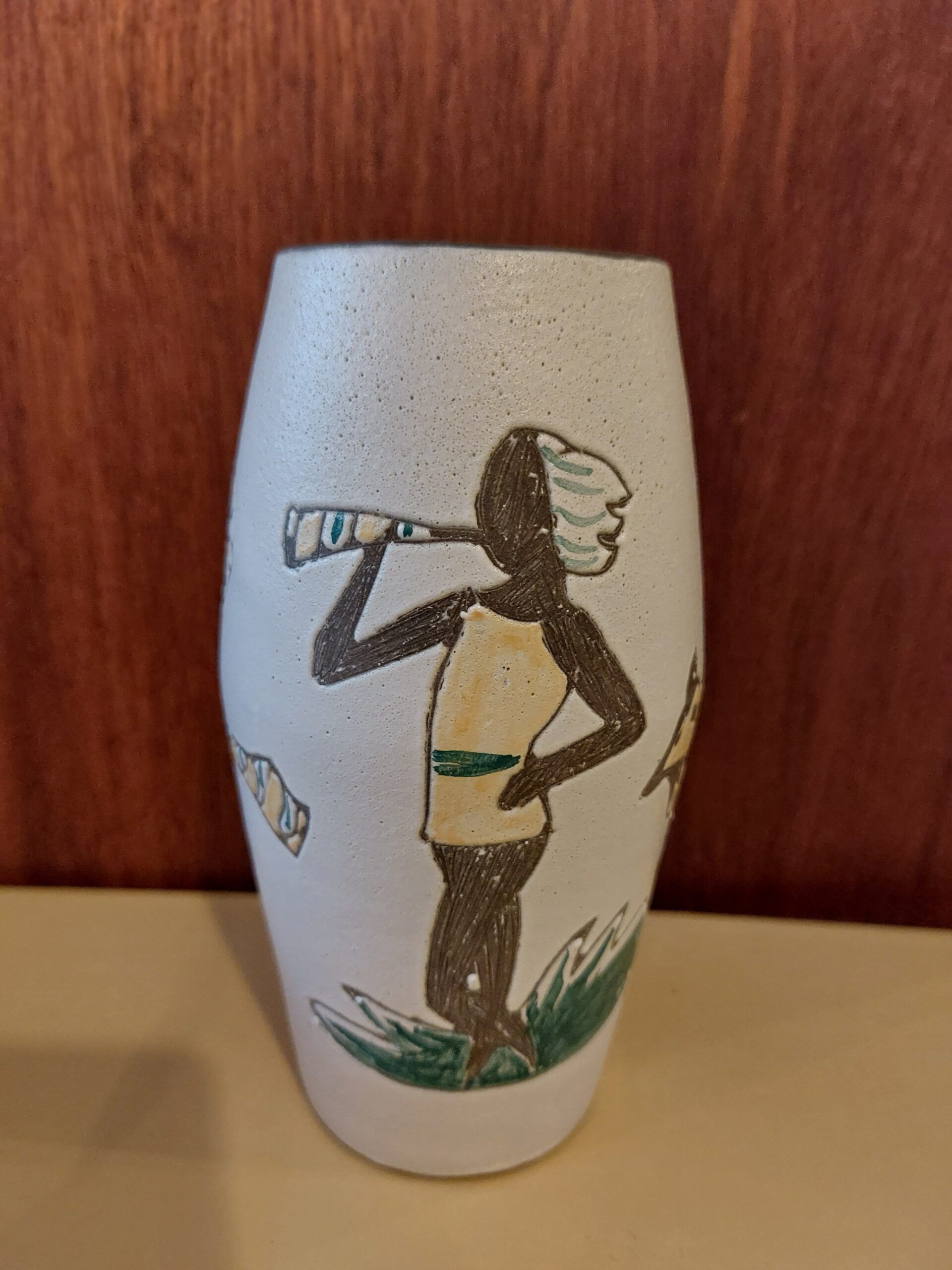 Wit aardenwerk vaasje uit de zestiger jaren. Met een afbeelding in de kleuren groen bruin en geel. Vaasje is niet gemerkt. Hoogte 16 cm. In goede conditie.