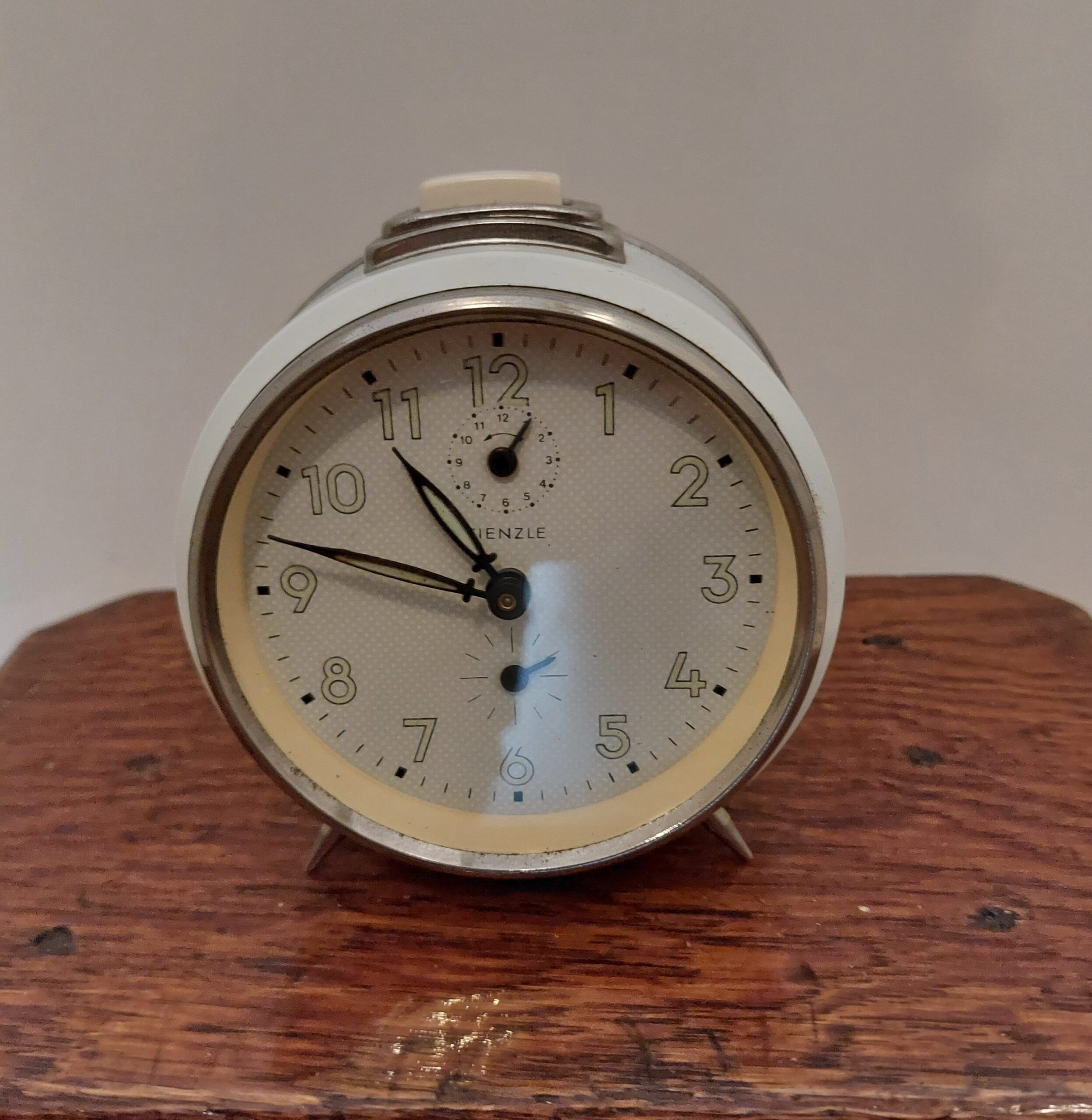 Vintage mechanische wekker van het Duitse merk Kienzle. Crèmekleurig en chromen details en oplichtende wijzers. Voorzien van een alarm. Hoogte 11 cm.