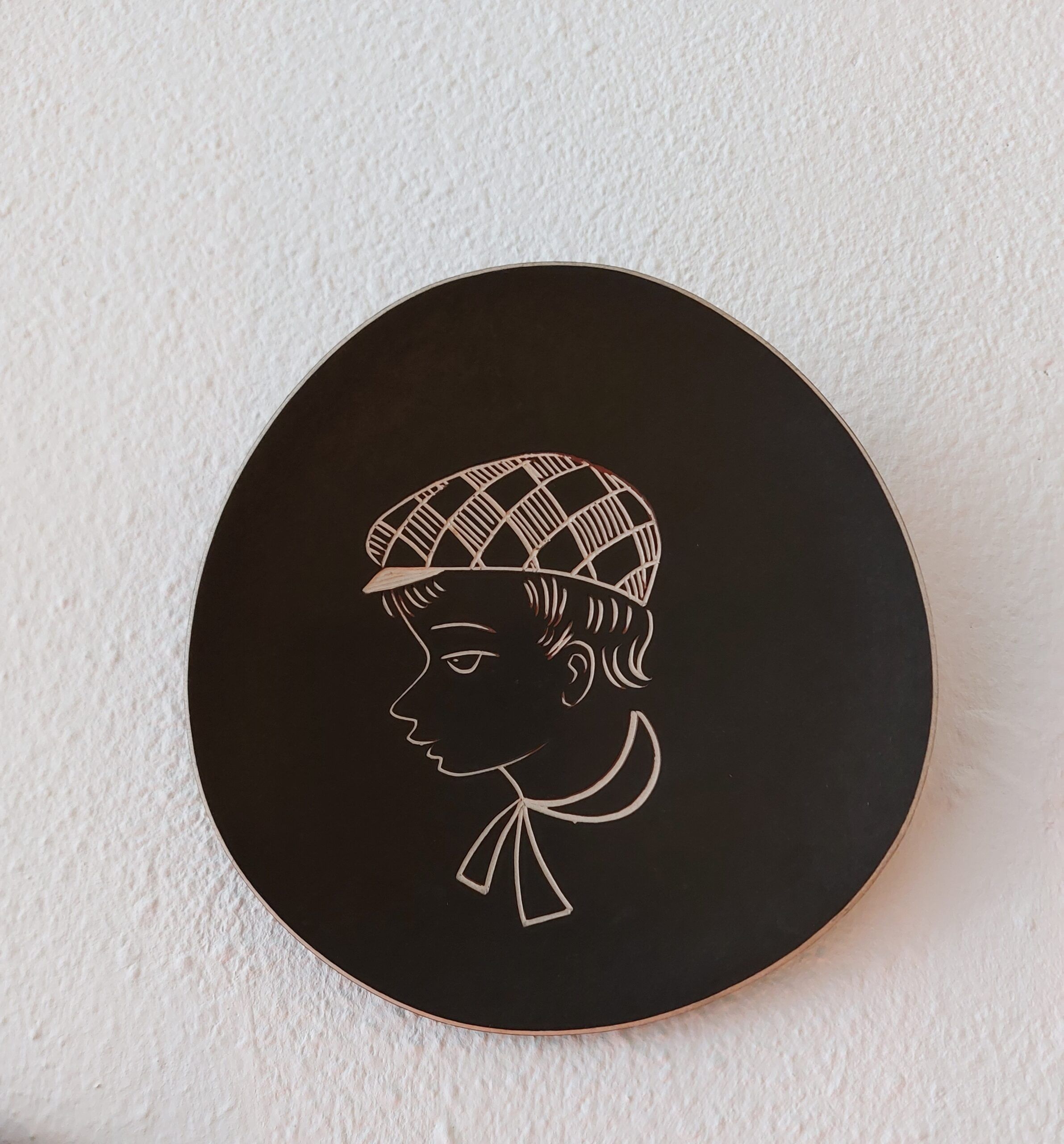 Wandbord. Potterie Boonstra? Jaren ’50 van de vorige eeuw. 22cm. Portret gemaakt door Dries Holten. Achterkant beplakt met papier waar een lusje op zit om het bord op te hangen. In goede conditie.