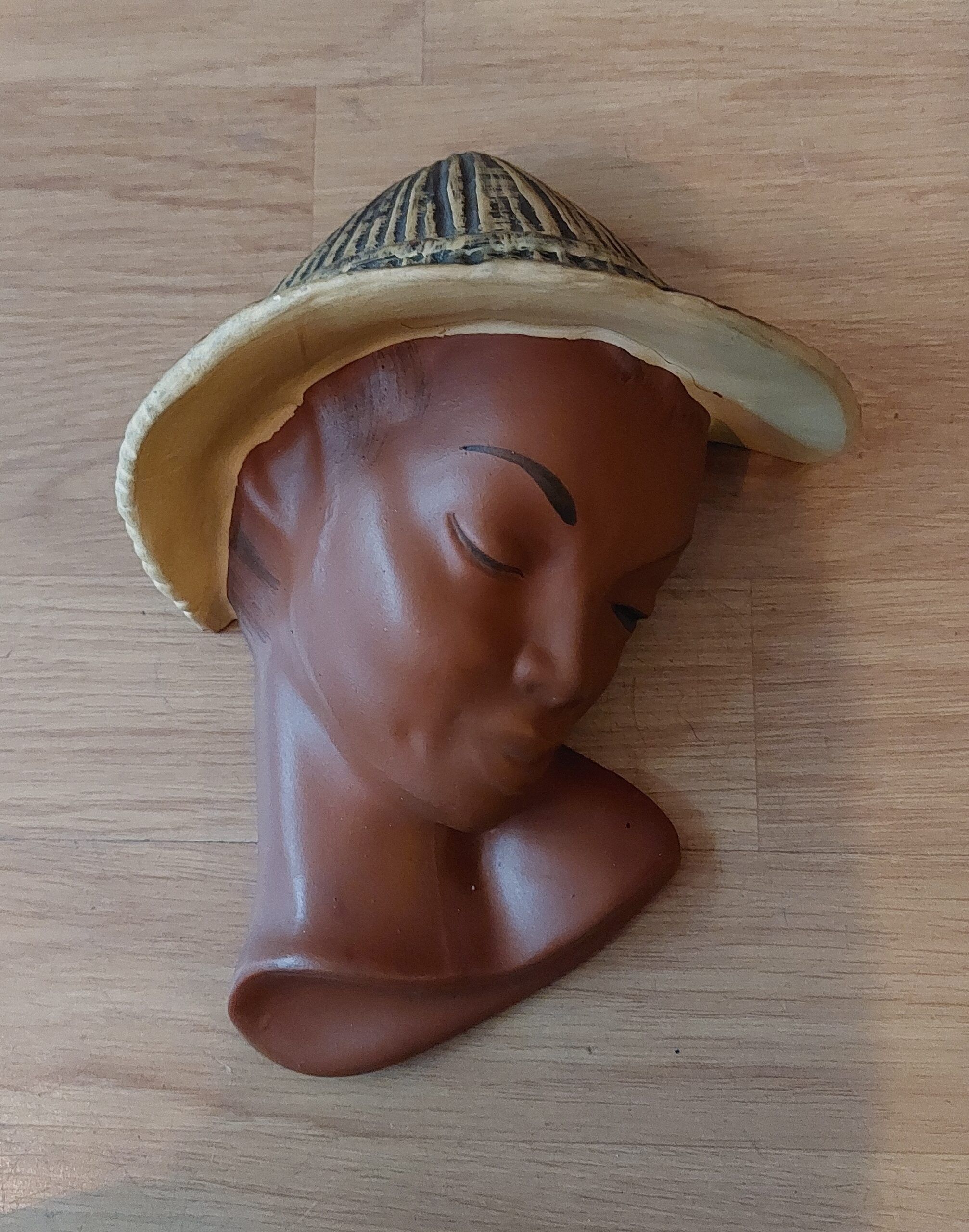 Aardenwerk wanddecoratie uit de jaren ’60 in de kleuren bruin geel en zwart. 20 x 15cm. Niet gemerkt. In goede staat.